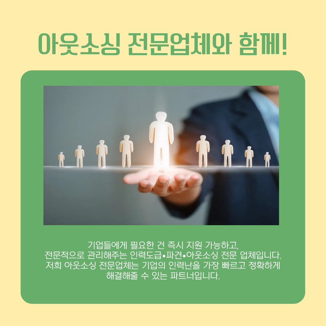 이제 혼자서 모든 부담을 떠안기보다는 전문성을 갖춘 인력 도급 아웃소싱 전문 업체에 맡겨보세요.
